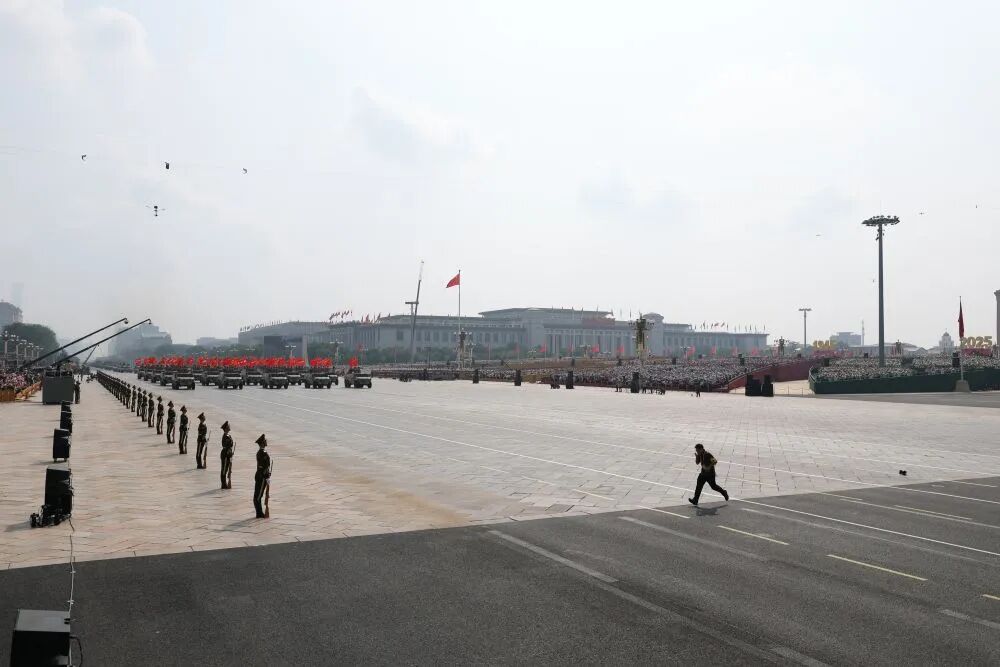 9时59分,终末一个徒步方队以整皆整齐、刚烈有劲的设施朝我而来,此时我的心也开动飞速地越过,我大口呼吸,试图让我方随机稳住。方队通过后,我坐窝抱起修复,数着线标,相接冲到安全线位置,放手、搬动、撤退。跑回点位后,我喘着粗气,迅速拎起另一台相机,持续拍摄,因为我知说念,这么要紧的历史现场,错过了就再也莫得了,一定得负重致远。