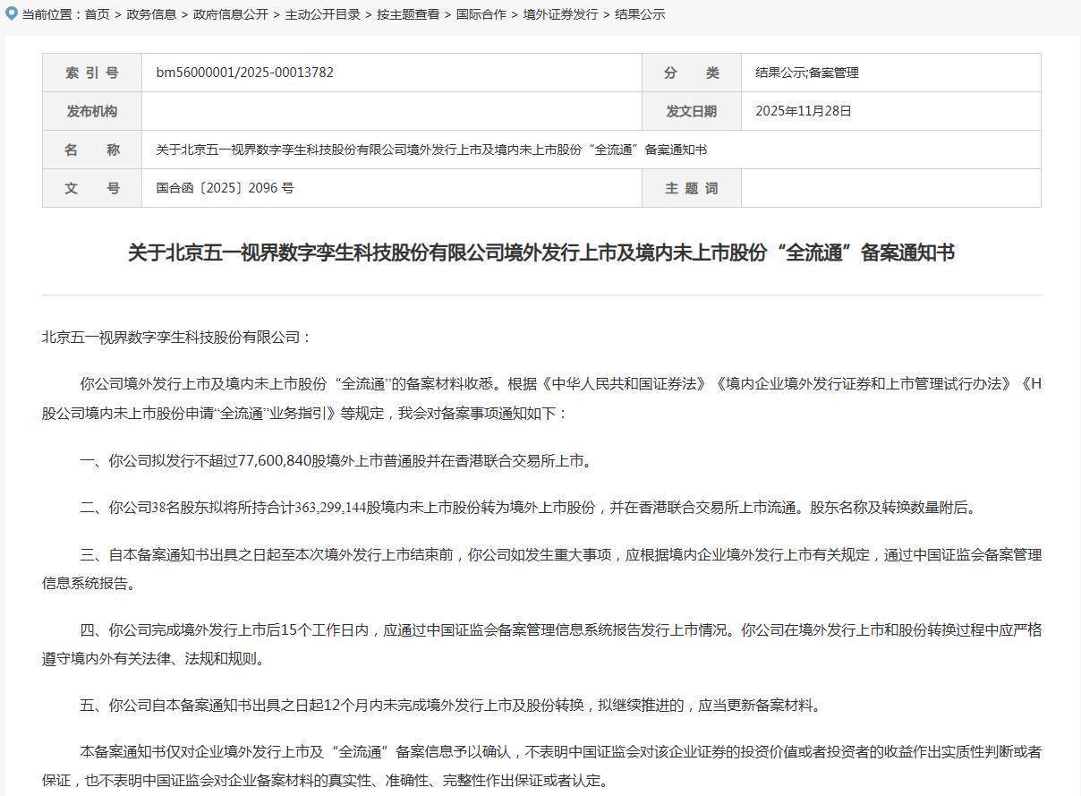 此前于11月28日,中国证监会官网发布《对于北京五一视界数字孪生科技股份有限公司境外刊行上市备案见告书》。阐发见告书,五一视界拟刊行不额外77,600,840股境外上市无为股并在香港结伙走动所上市。公司38名鼓吹拟将所抓共计363,299,144股境内未上市股份转为境外上市股份,并在港交所上市畅通。这意味着,五一视界已获取进入港交所聆讯阶段的前置条目。
