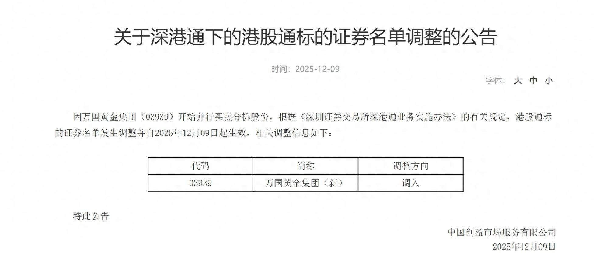 智通财经APP获悉天元证券天元证券,12月9日,深交所发布对于深港通下的港股通地点证券名单调度的公告。因因万国黄金集团(03939)开动并行营业分拆股份,凭证《深圳证券来回所深港通业务推论看法》的关连轨则,港股通地点证券名单发生调度,万国黄金集团调入港股通名单并自2025年12月09日起成效。