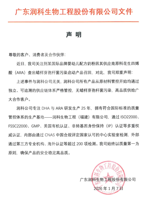 同日,广东润科生物工程股份有限公司也发布声明称,调回事件与润科公司无关,润科公司通盘居品从原材料管控启动均通过安适、可记忆的供应链体系严格管控,无蜡样芽孢杆菌期凌。