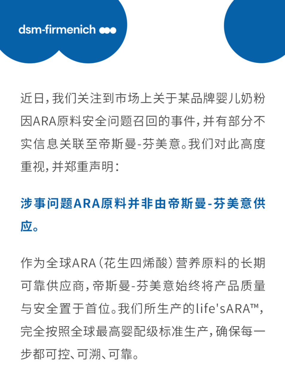 1月7日,帝斯曼通过官方公众号发布声明称,涉事问题ARA原料并非由帝斯曼-芬盛情供应。该公司同期称,因以上事件影响,其ARA原料需求激增,将全力衔尾产能,知足阛阓需求。