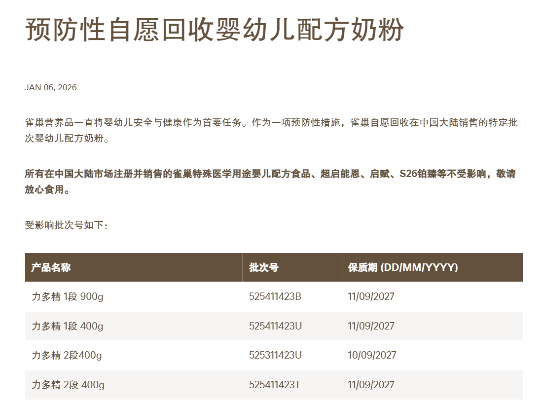 1月6日,雀巢大中华区官方网站发布两则《驻守性自发回收婴幼儿配方奶粉》公告。一份公告针对在中国大陆销售的特定批次婴幼儿配方奶粉,波及力多精、铂初能恩、舒宜能恩以及惠氏膳儿加儿童成长奶粉等30批次居品。另一份公告则针对通盘这次涉事的入口自欧洲、在中国大陆跨境电商渠说念销售的婴幼儿配方奶粉,波及“Nestlé BEBA Supreme”“惠氏Wyeth启赋将来”等41批次居品。