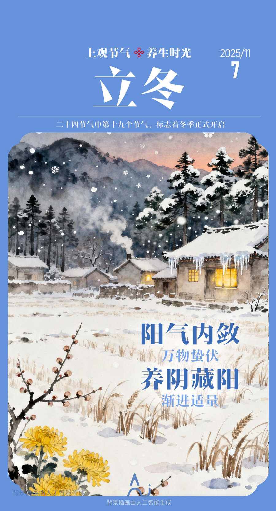 “立,建始也;冬,万物保藏也。”立冬看成二十四骨气中第十九个骨气,秀雅着冬季认真开启,寰宇间呈现“万物保藏、遁入凉爽”的郑重风景。《素问·四气调神大论》明确纪录“冬三月,此谓闭藏”,精确神情立冬“阳气内收、万物冬眠”的中枢特征。对东谈主体而言,阳气会随当然节拍同步敛藏,秋冬“养阴”是“藏阳”的基础。