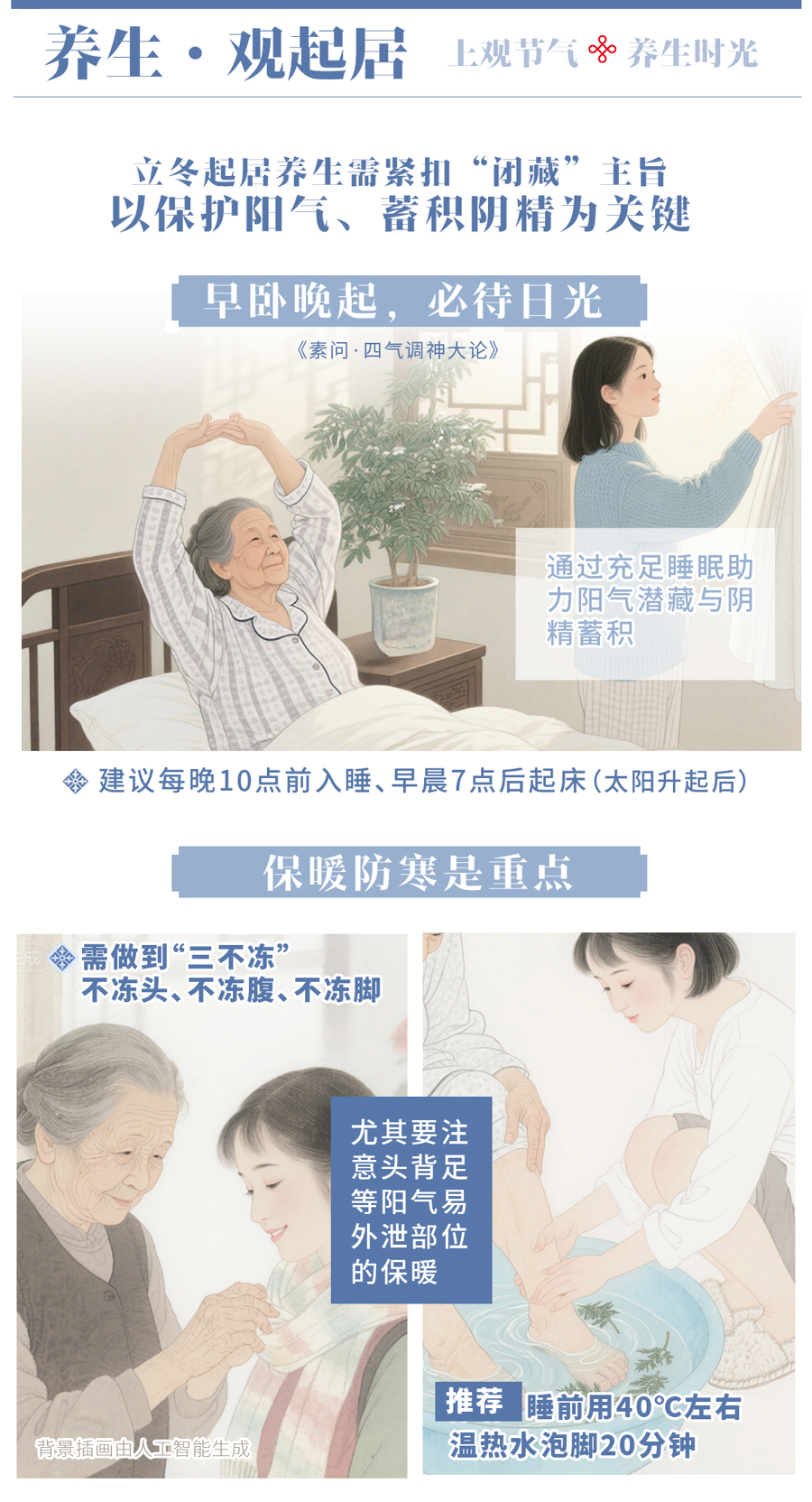 立冬起居养生需紧扣“闭藏”主旨,以保护阳气、积贮阴精为关键。应解任《素问·四气调神大论》中“早卧晚起,必待日光”的经典准则。聚拢当代作息限定,提倡每晚10点前入睡、黎明7点后起床(太阳升空后),通过足够寝息助力阳气遮挡与阴精积贮。