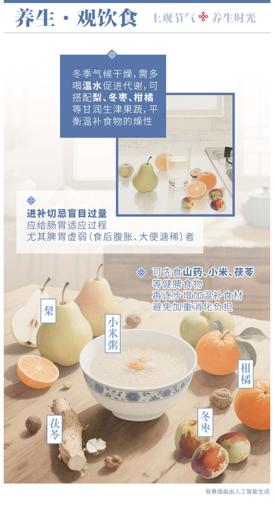 冬季好意思瞻念干燥,需多喝温水促进代谢,可搭配梨、冬枣、柑橘等甘润生津果蔬,均衡温补食品的燥性。进补切忌盲目过量,应给肠胃顺应进程,尤其脾胃陈腐(食后腹胀、大便溏稀)者,可先食山药、小米、茯苓等健脾食品,再慢慢增多温补食材,幸免加剧消化包袱。