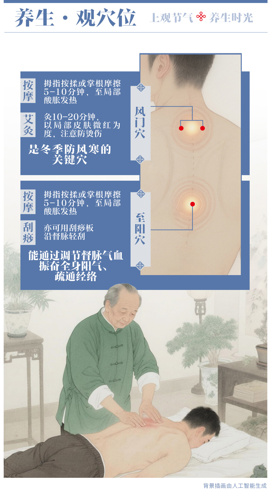 用拇指按压揉动5-10分钟至局部酸胀发烧,或用掌根擦至皮肤透热;艾灸每次10-20分钟,以局部皮肤微红为宜,幸免烫伤,是冬季防风寒的关键穴。