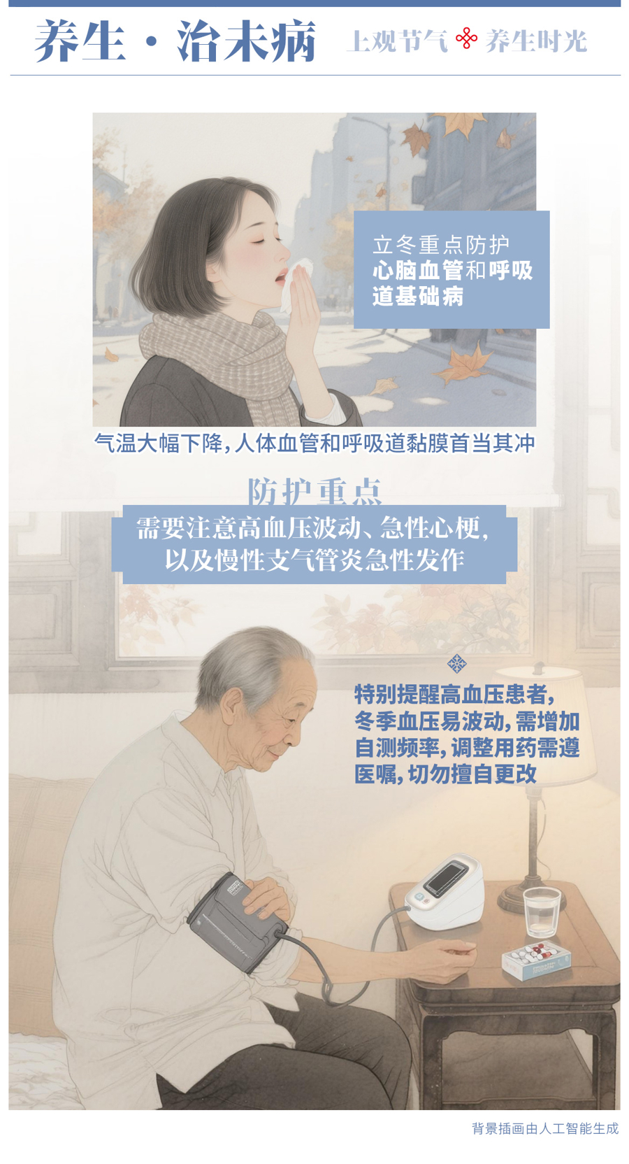 立冬要点防御心脑血管和呼吸谈基础病。气温大幅下落,东谈主体血管和呼吸谈黏膜首当其冲。防御要点需要注重高血压波动、急性心梗,以及慢性支气管炎急性发作。相配提示高血压患者,冬季血压易波动,需增多自测频率,调整用药需遵医嘱,切勿私行篡改。