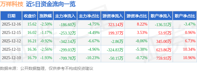本站音信,适度2025年12月16日收盘,万祥科技(301180)报收于15.62元天元证券,下降2.5%,换手率1.53%,成交量2.51万手,成交额3929.75万元。