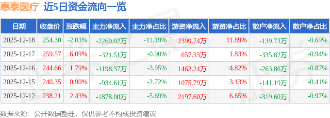 本站音书,铁心2025年12月18日收盘,惠泰医疗(688617)报收于254.3元天元证券,下落2.03%,换手率0.56%,成交量7880.0手,成交额2.02亿元。